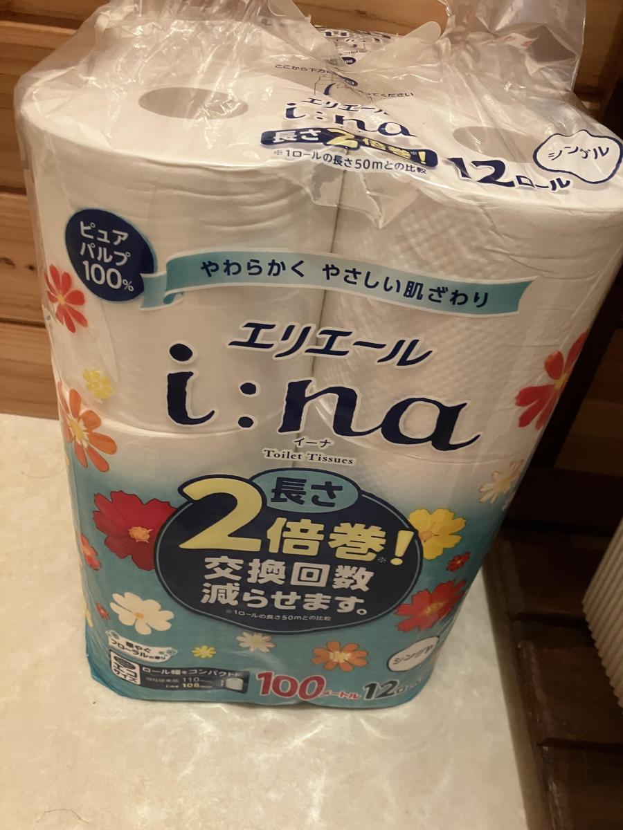 エリエールの【イーナ】100m✕12ロール入っています。PBのペーパーの方が安いけど、やっぱり質が悪いので、こちらを買いました。