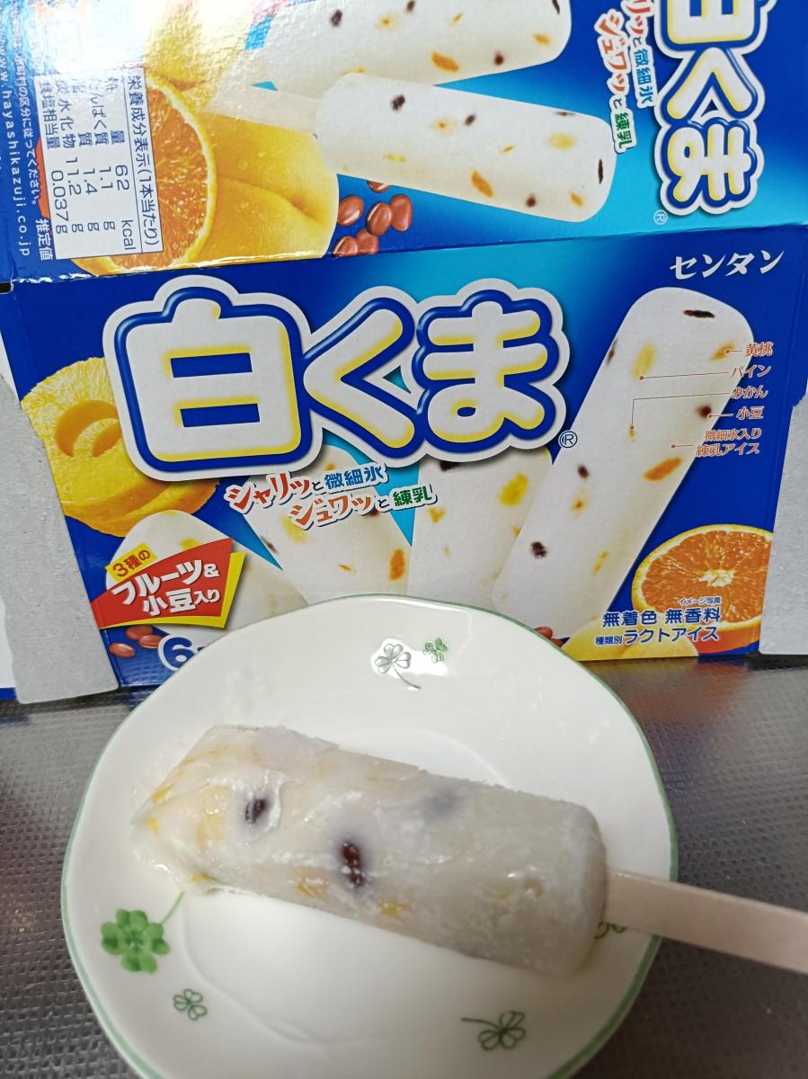 濃厚ミルクと言うよりは、サッパリシャリシャリしています。桃、パイン、ミカン、小豆が入っていて、ひと口噛むとジューシーです。カップの白くまもいいですが、こちらも手軽に食べれていいです。