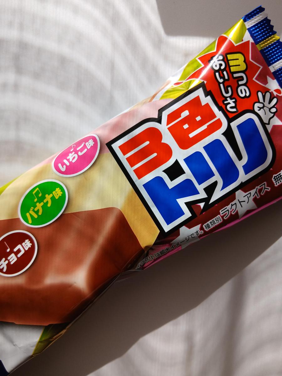 ラクトアイスなので濃厚さはないが素朴な味わい。チョコとバナナとイチゴの味を一つで三つも楽しめるのでコスパもよい。甘さもちょうどいい。