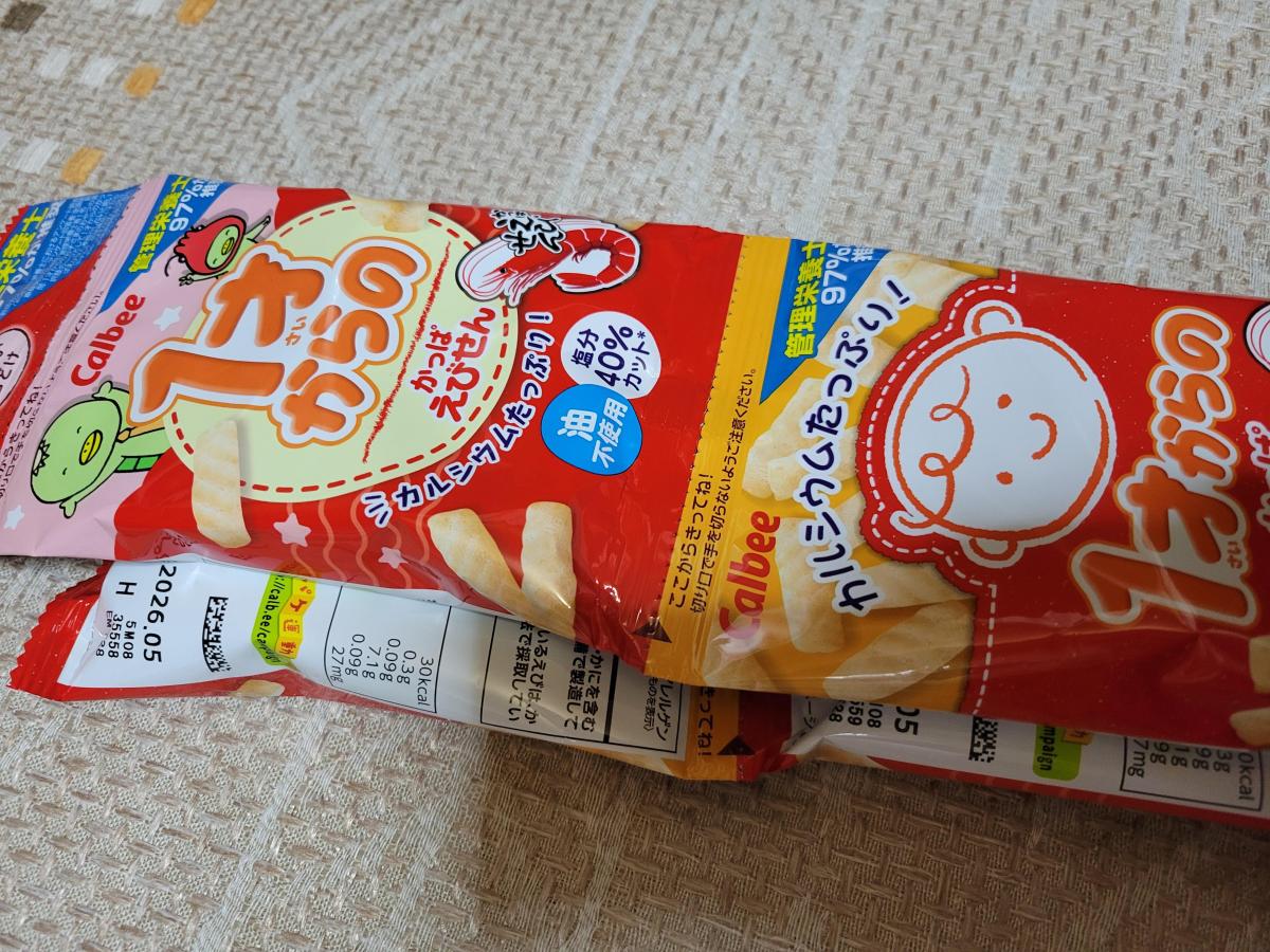 普通のかっぱえびせんの風味はそのままに塩分を抑えてあるので小さい子どもにも安心して与えられます。口溶けも良いので1歳代の子でも食べやすそうです。