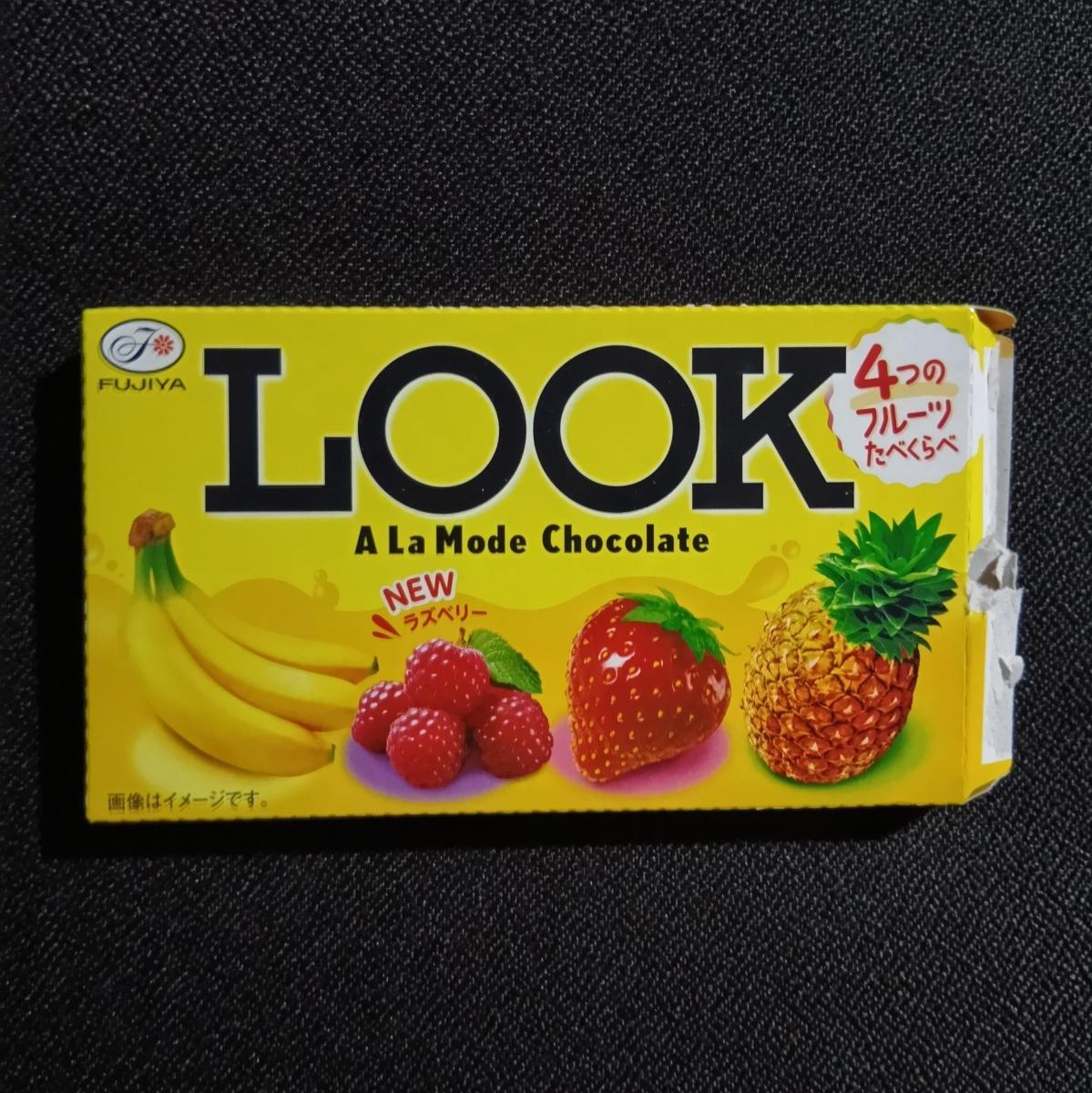 ルックのア・ラ・モード、4種類のフルーツのアソートタイプです。初めて個包装でファミリーパックを見つけました。バナナ、ラズベリー、パイン、ストロベリーの4種類どれもフルーティーさとチョコレートがバランス良く、美味しかったです。個包装で手軽に食べられるのも嬉しいです。