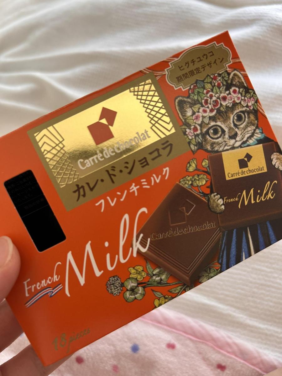 久しぶりに高級系チョコレートを購入しました。パッケージの猫ちゃんが可愛すぎて。ヒグチユウコ様の期間限定デザインだそうです。心の中で買い占めました。可愛いです素敵です。こちらはカレ・ド・ショコラのフレンチミルクです。ミルクのまろやかな味わい、なめらかな口どけ。とても美味しかったです。10分も経たないうちに、残り3枚になっていました。。美味しすぎて危険です。ご馳走様でした。