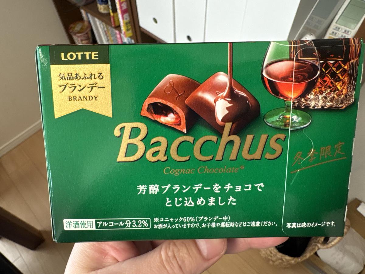 今年も冬の大人のチョコ、バッカスを購入しました。緑色のパッケージがオシャレで好きです。甘いチョコの中にはしっかりとアルコールのきいたブランデー、コニャックが入っておりお酒の風味たっぷりで高級感があります。この冬またリピートして購入したいです。