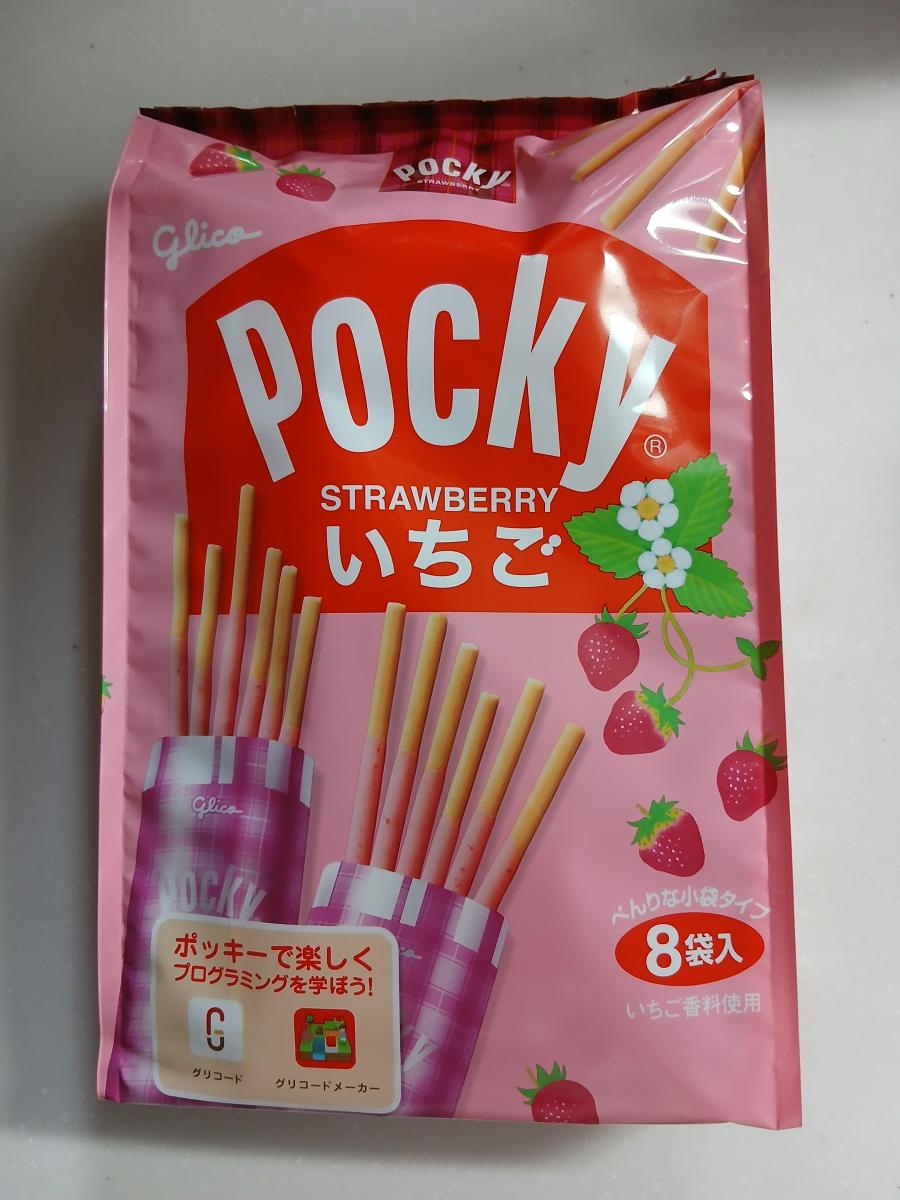 長く親しまれている、いちご味のポッキー。8袋入でシェアしやすいです。甘酸っぱい味で美味しいです。ポッキーの部分との相性も良くて、食べ応えも気に入っています。家族で楽しめる味ですね。