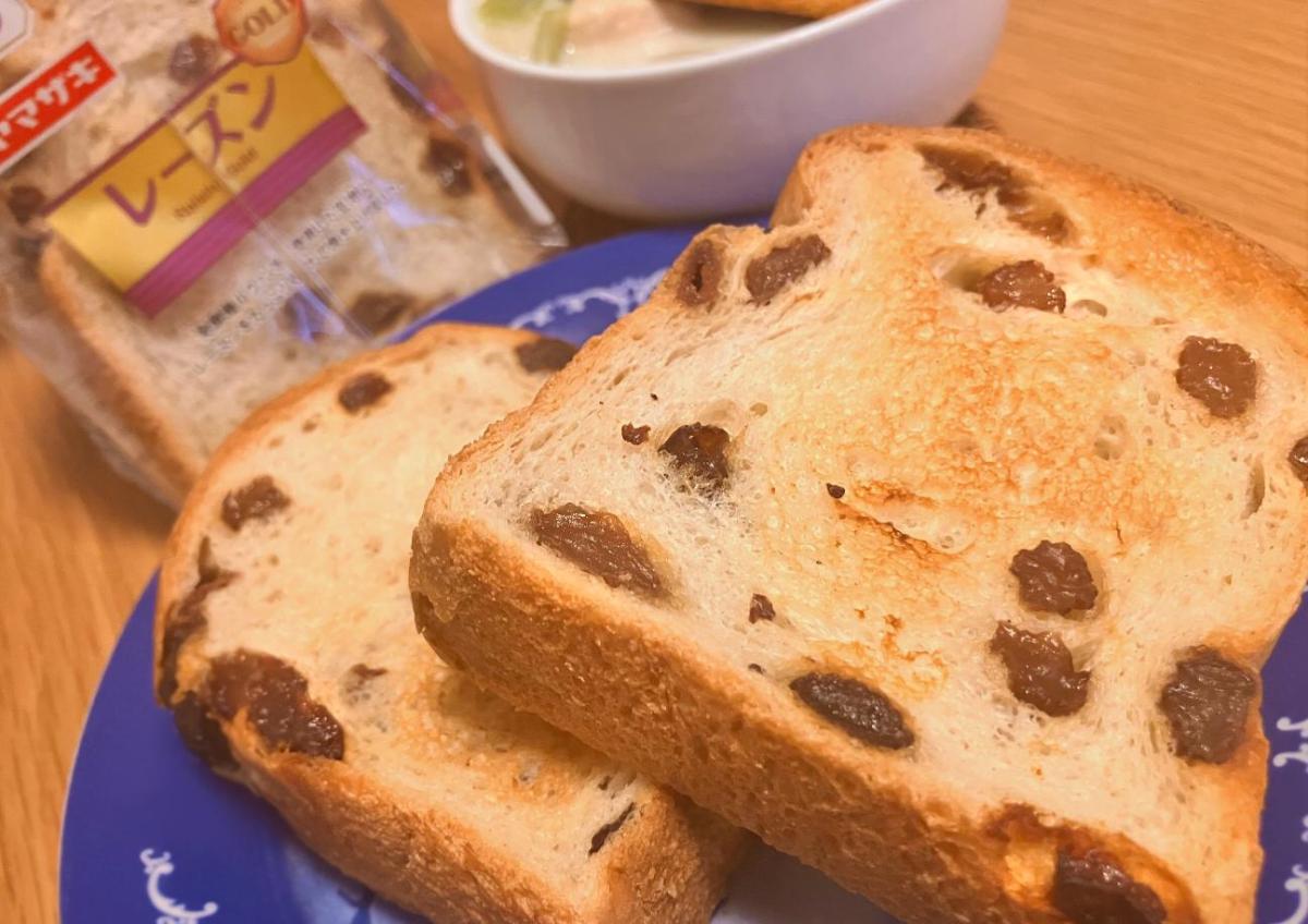 ト―ストにすると、表面はサクッと中はもちっと。そのまま食べると、しっとり柔らか生地でおやつにもマッチ。どちらの食べ方も美味しいですが、個人的にはトーストしてバターを塗って食べるのが◎。焼くことでレーズンがよりジューシーになって甘酸っぱさも増し、そこにバターの塩味と生地の甘味が合わさって、とても贅沢な味わいに仕上がります。