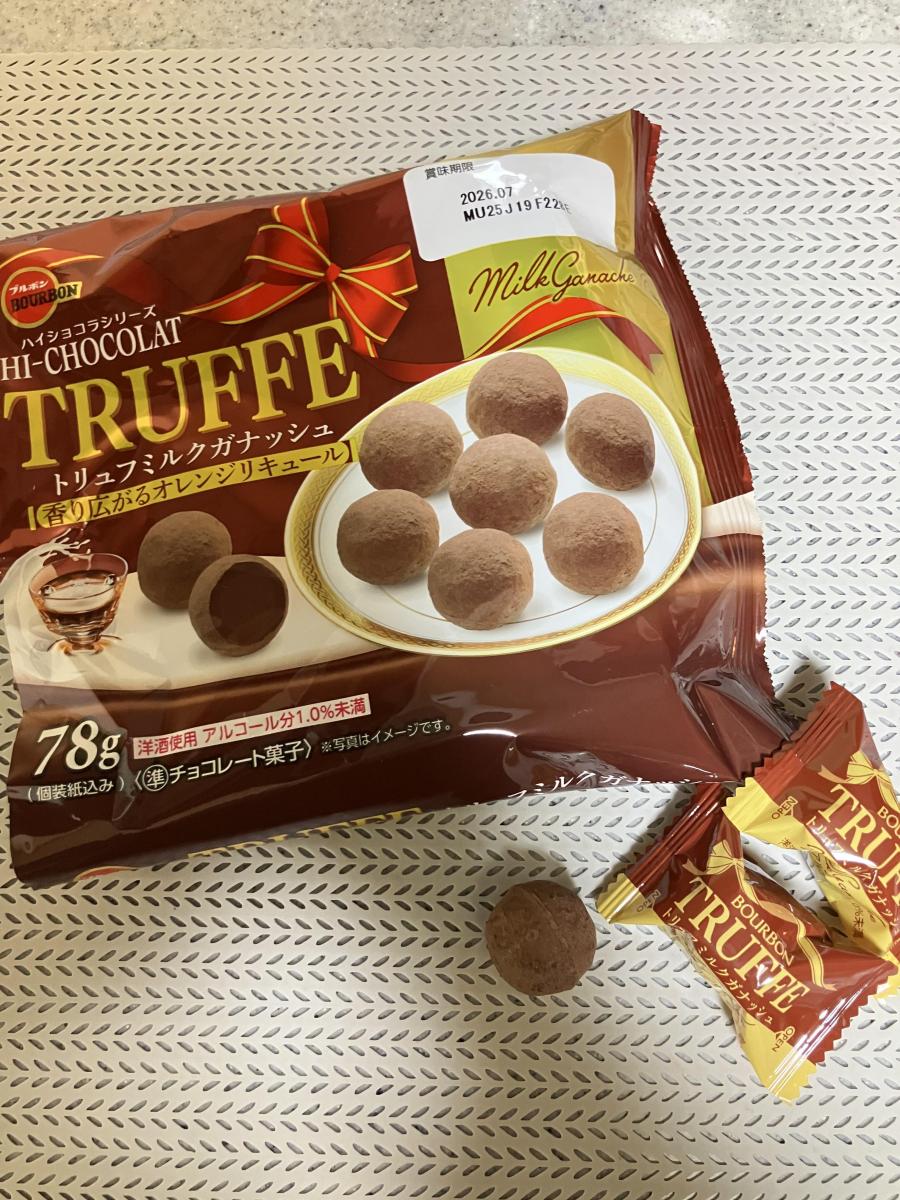 ブルボンのお菓子は、お手頃価格なのに、ちゃんとおいしいのでお気に入りです。こちらのチョコレートもそのひとつ。ころんと大きめのトリュフで、カカオパウダーをしっかりと纏っていて、中にはとろりとしたガナッシュ。一粒で満足感があります。