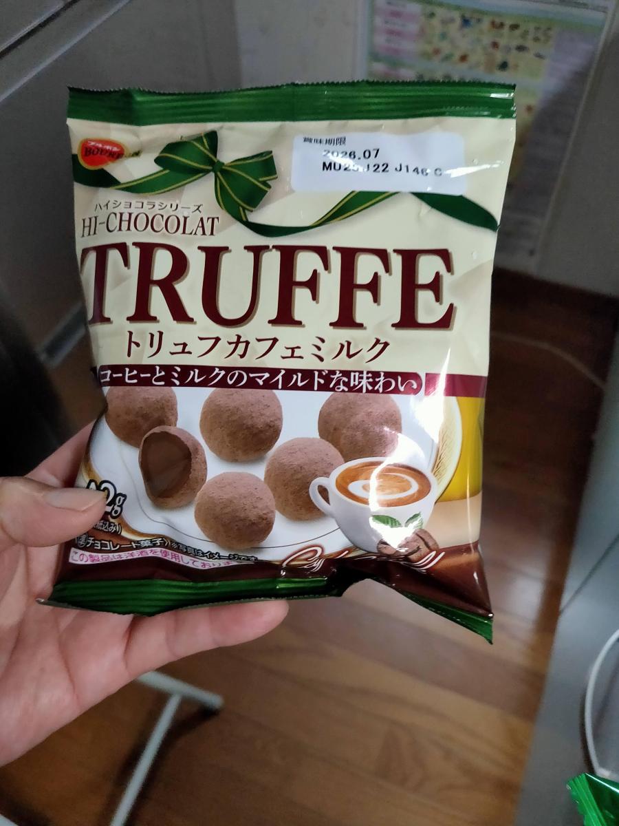ブルボンのトリュフシリーズは、個包装なのでちょっとずつ食べられるのが良いですね。こちらのカフェミルクについては、コーヒー感がありつつも、苦味がなく、まろやかなミルクの味わいが特徴的です。