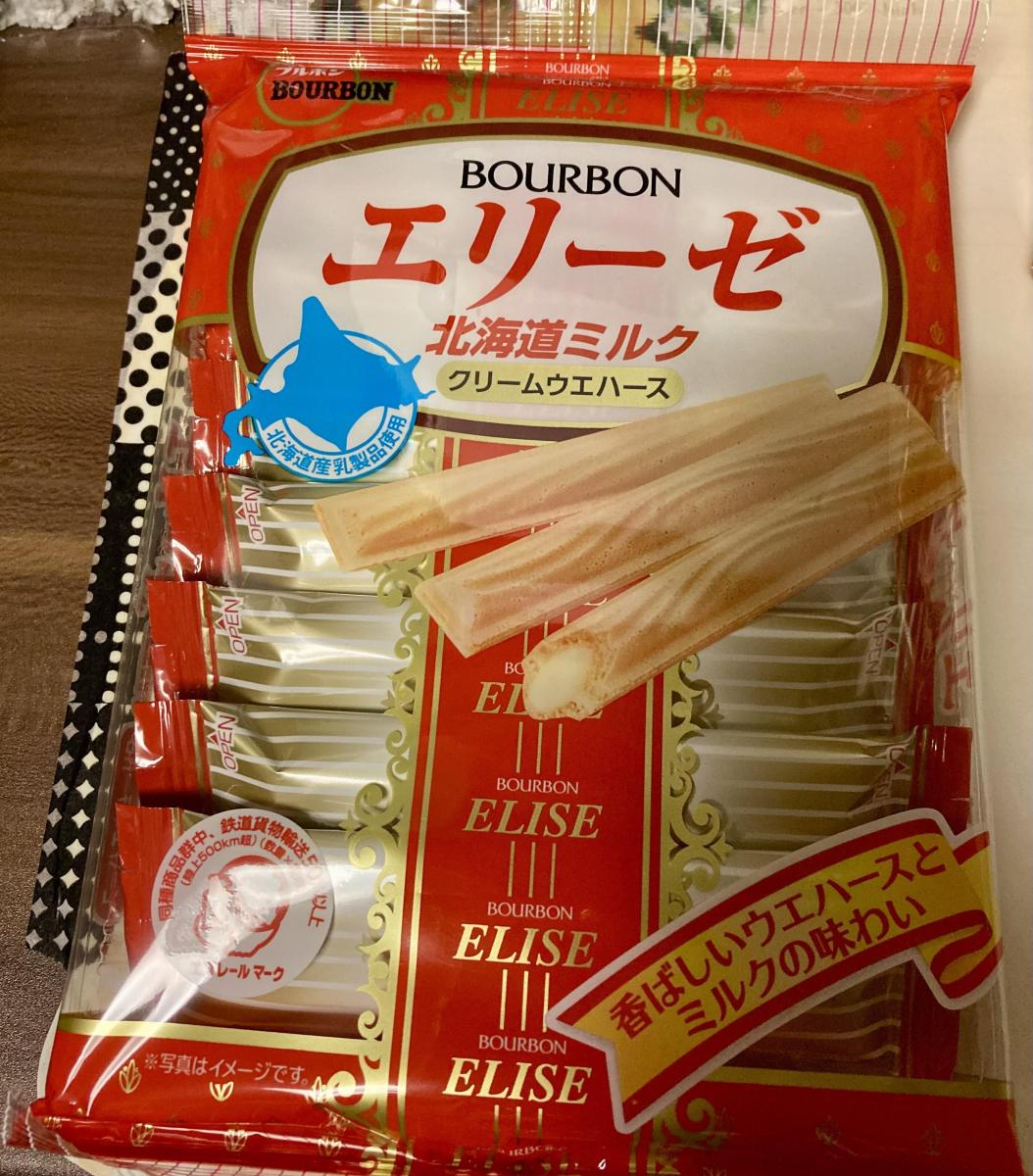 ブルボンの大定番お菓子の一つのエリーゼ。小さい頃から食べてる間違いない美味しさです。北海道マークに引き寄せられました。ミルクの甘い香りが食べる前から美味しそう。サクサクのウエハースに甘い濃厚なミルククリームが美味しいです。コーヒーに合います。