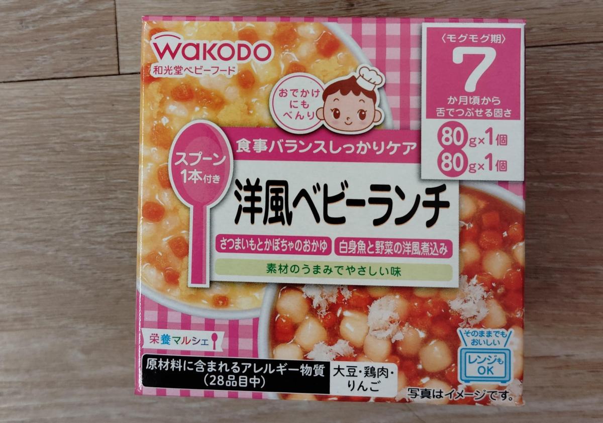和光堂のベビーランチシリーズは蓋を開けたらそのまま食べさせられるので、おでかけ時に重宝しています。この一箱に「さつまいもとかぼちゃのおかゆ」「白身魚と野菜の洋風煮込み」の2種類の離乳食が入っています。洋風煮込みだなんて、お洒落な離乳食だなと思いました。スプーンが付いており大変便利で助かるのですが、もう少しスプーンが大きいとありがたいです。