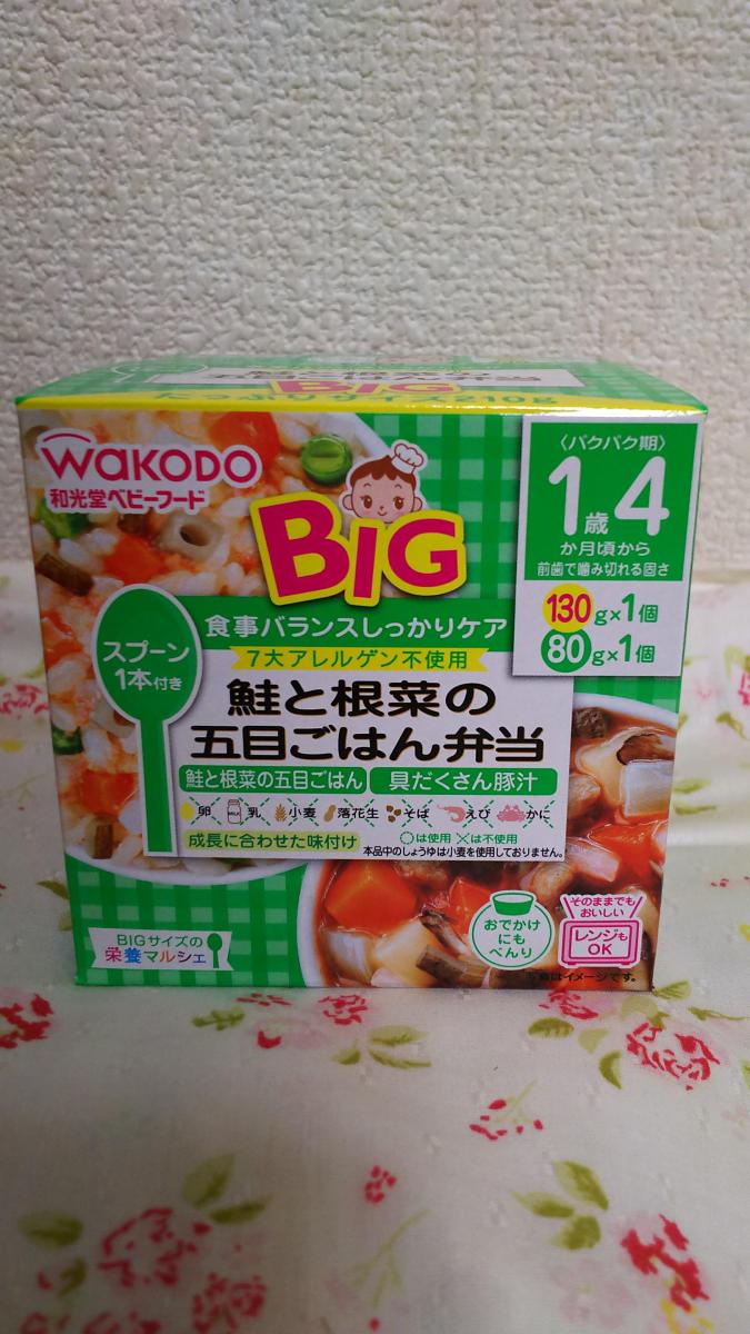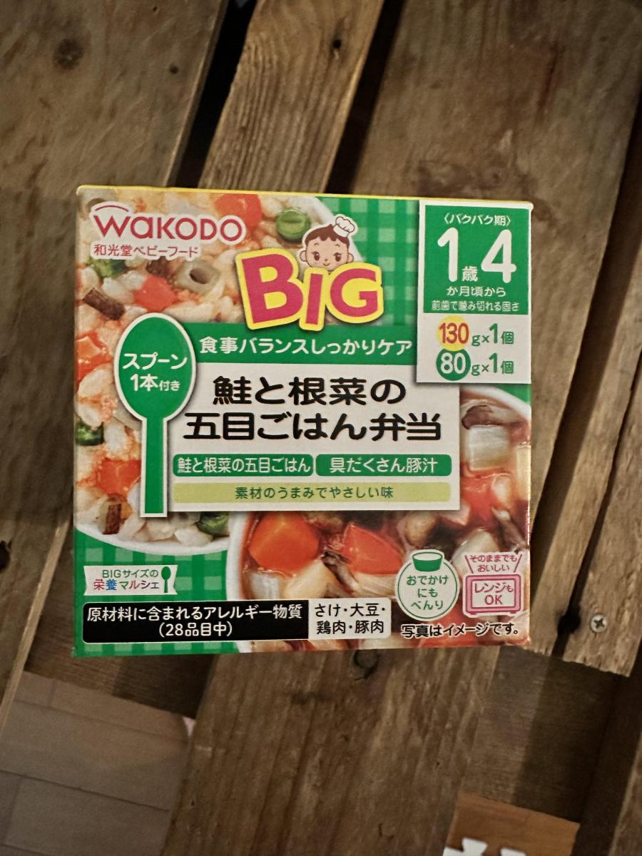 和光堂の離乳食BIGタイプ。鮭と根菜の五目ごはん弁当。1歳4ヶ月からの鮭と根菜の入ったやわらかめごはんと、具だくさんの豚汁がセットになっています。ごはんが130gとボリュームがあり、うちのこはたくさん食べるので、満足感のある量です。