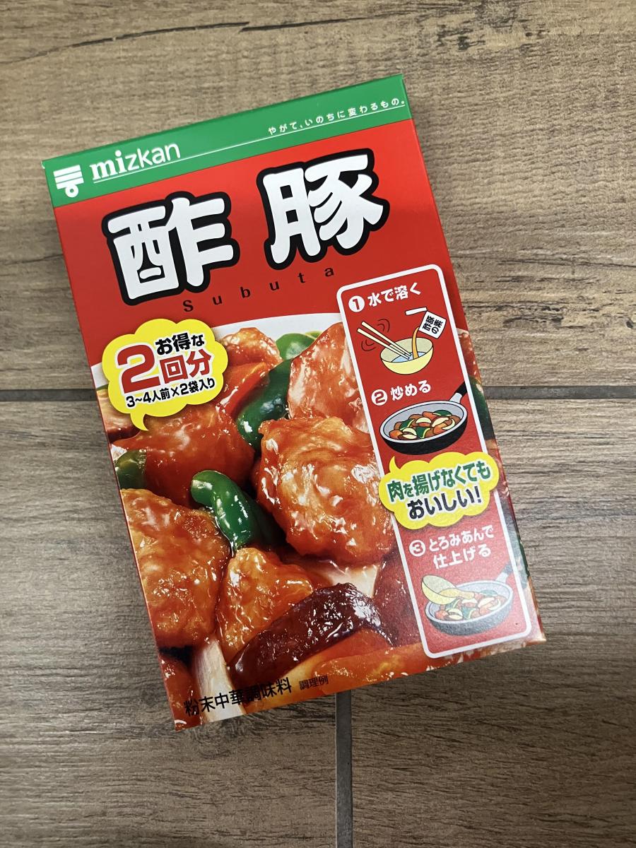 粉末を水に溶いて作るタイプの酢豚の素です。