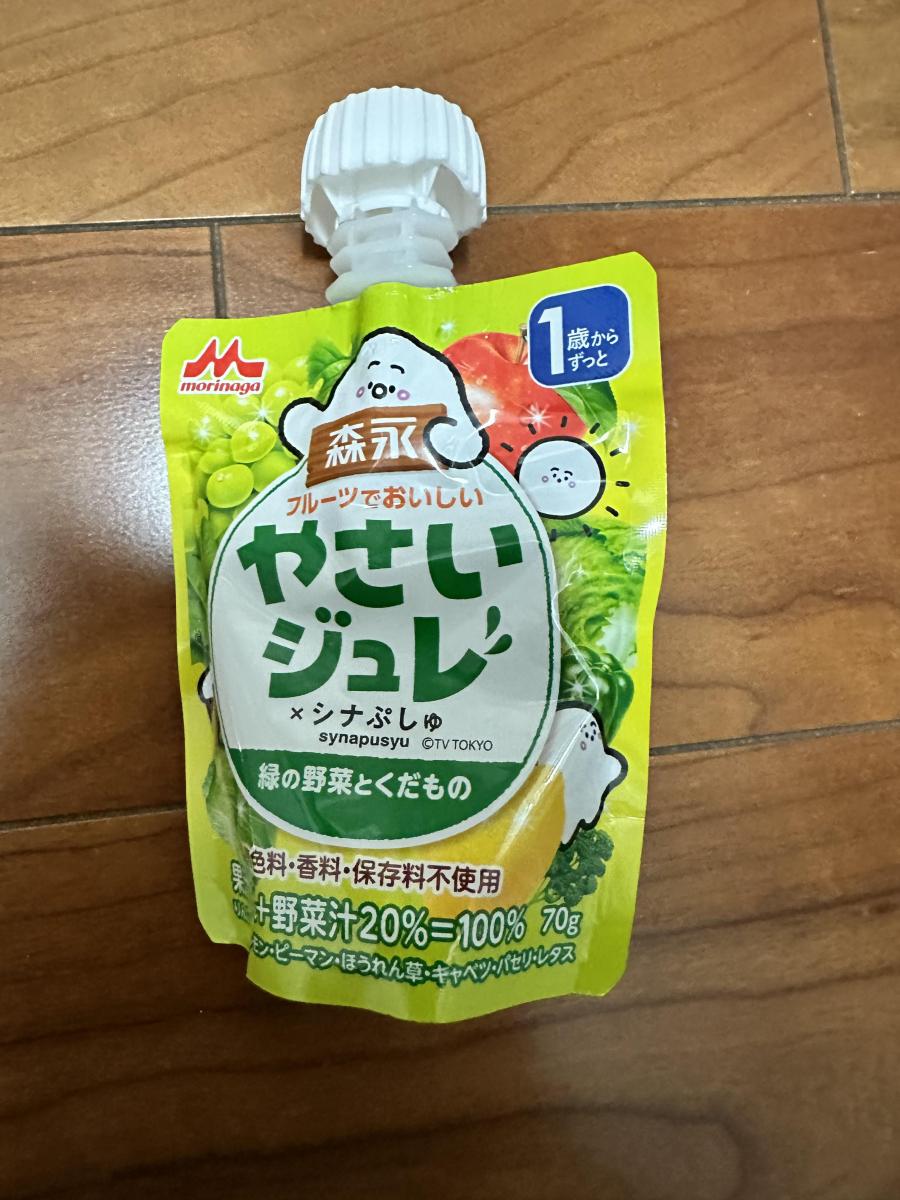 小さいお子様がいるお家へ遊びに行ったとき、飲み物と、こちらの可愛らしい野菜ジュレを見つけて購入してみました。以前もこちらと同じシリーズを購入して喜んでいただけたので、期待をこめて... 着色料、香料、保存料不使用というところが体に優しくていいなあと思います。味も野菜野菜せず、とても飲みやすかったようでよかったです。美味しく緑の野菜と果物を摂取していただけるのでいい商品だと思います。また、こちらの違う味も購入してみたいです。