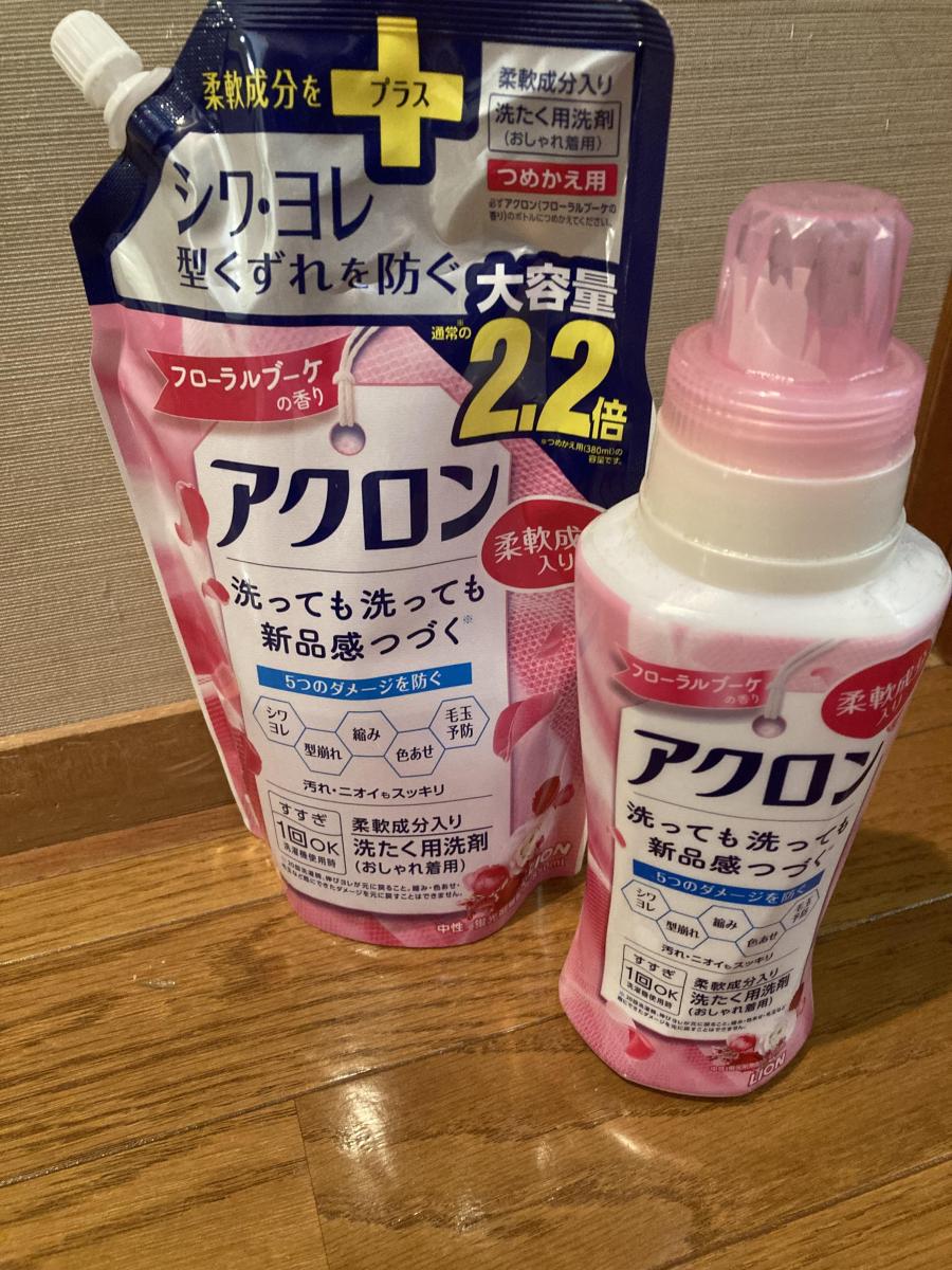 特に冬場のユニクロのニットや子どもたちの制服など、普通の洗剤ではちょっと不安な衣類もあるので、アクロンを使うようにしています。、香りはそこまできつくなく、バランスのいい香りでした。部屋干ししてもイヤなニオイが気になりませんでした。