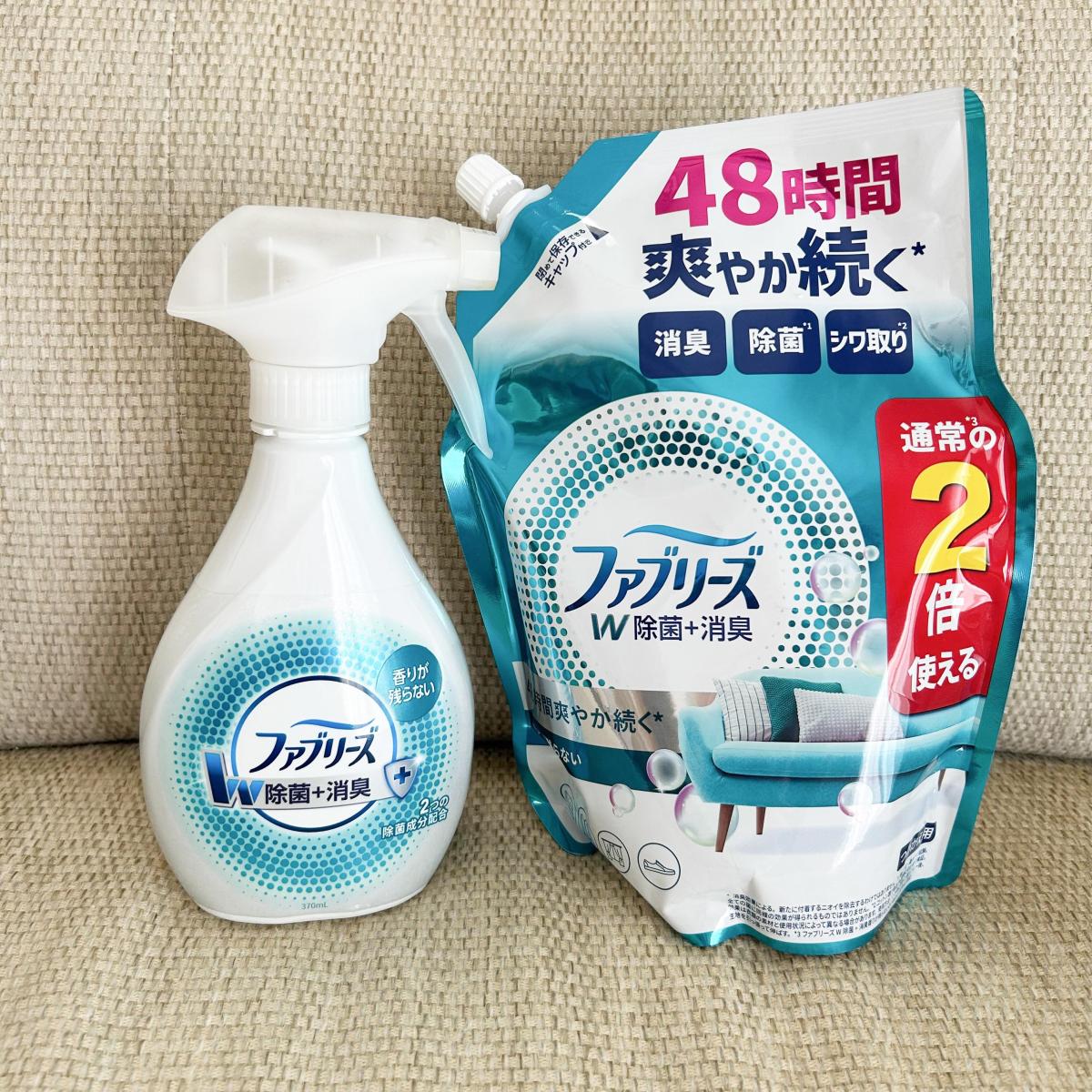 ソファやマットレス簡単には洗えないものにファブリーズのダブル除菌が助かっています。香りがないタイプなので香りでごまかすことなく消臭できているかがわかります。