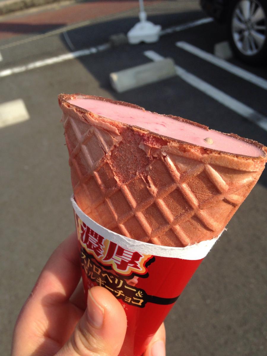 上のストロベリーチョコに食べ応えがあり、中身もぎっしりチョコもイチゴ味のアイスがあってかなり美味しいです。コーンもほんのりピンクなストロベリーコーンになっていて、目でも楽しめるアイスです。