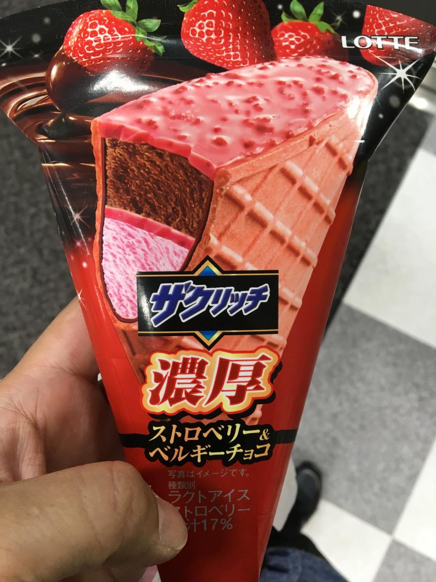 ロッテのザクリッチシリーズはどれも好きです。今回は濃厚ストロベリー&ベルギーチョコです。まず、一番上にストロベリーチップ、ストロベリーパウダー入りチョコから食べ始めます。この時点でイチゴチョコが濃厚で美味しかったです。さらに、濃厚なベルギーチョコアイスに続きます。そしてまた濃厚ストロベリーアイスです。サクサクの外側のストロベリーコーンも美味しくて、満足感あるザクリッチでした。
