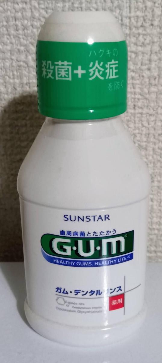 GUMのデンタルリンスはさまざまな種類がありますが、これはスタンダードながらもやや刺激が強いタイプです。夜と朝の歯磨きあとに使いますが、心地よい爽快感です。