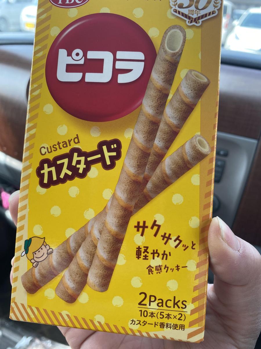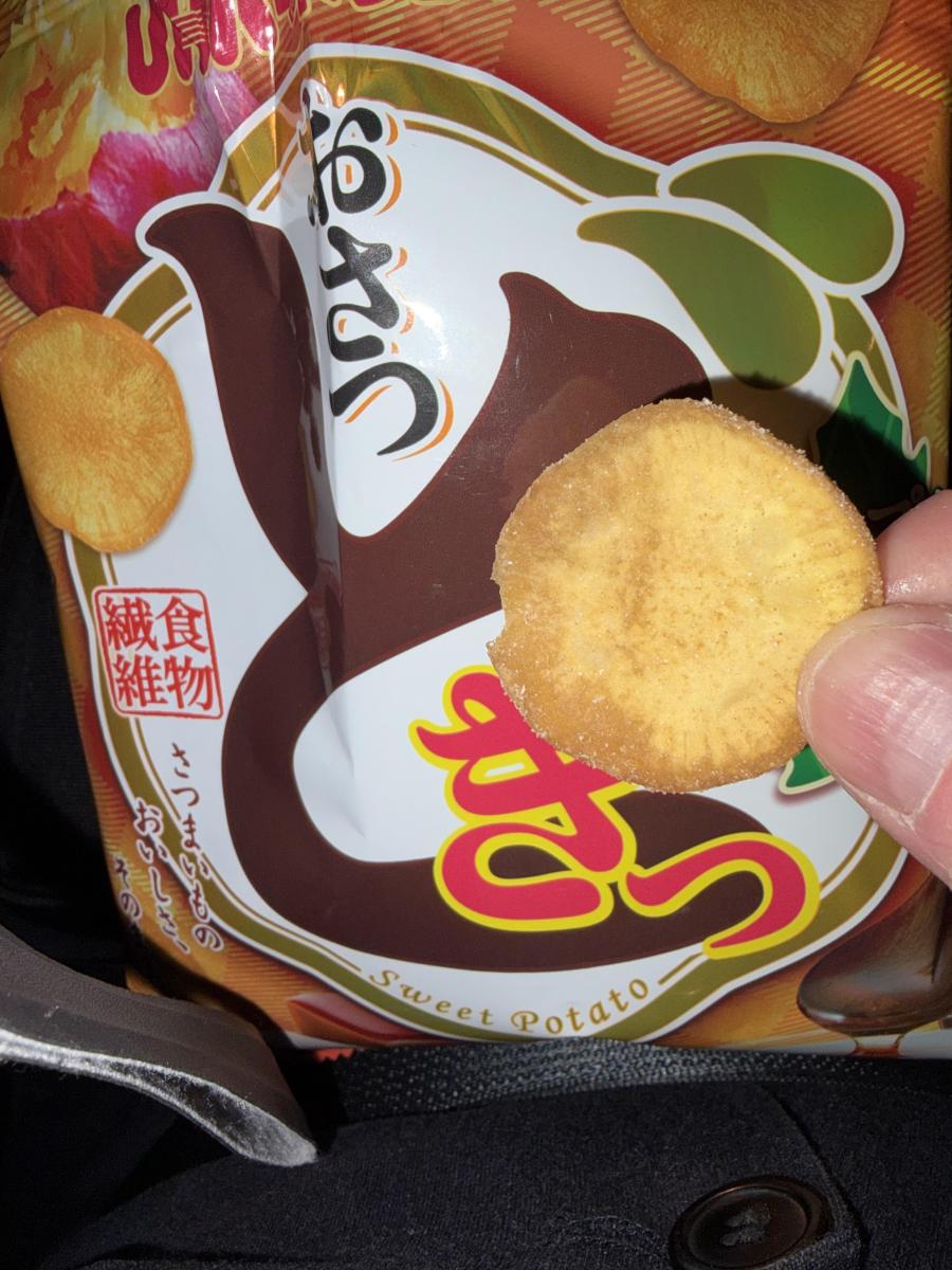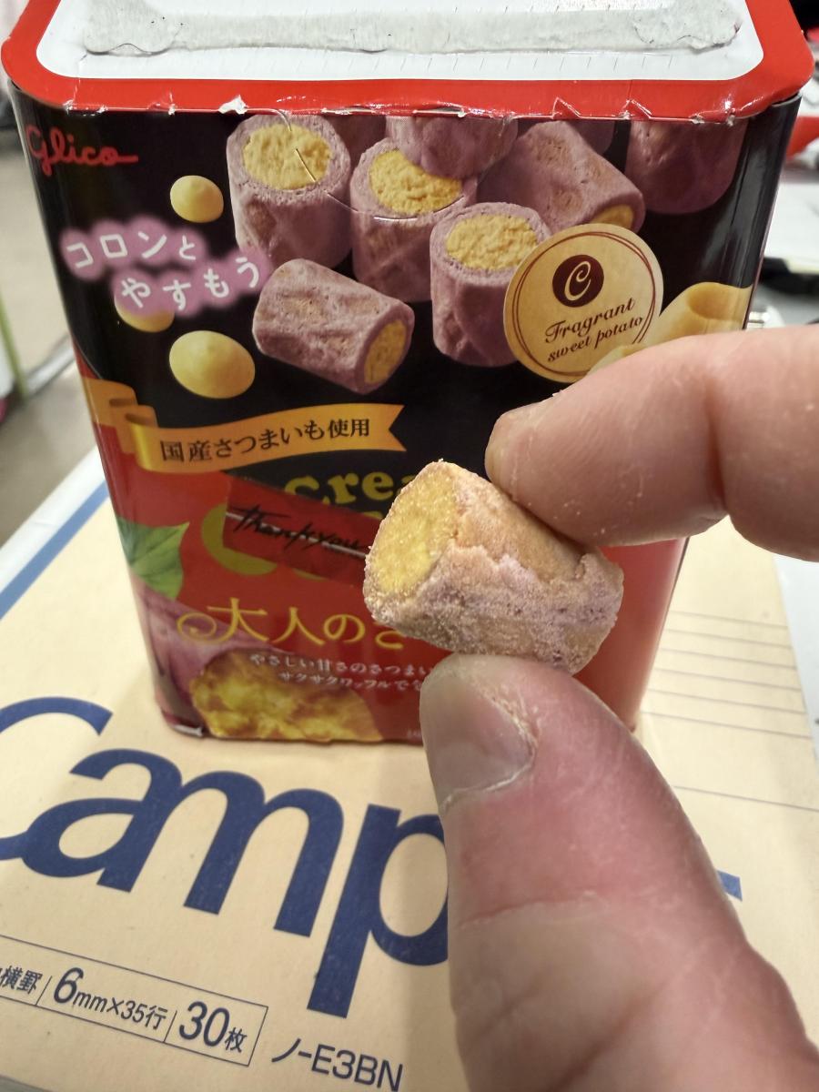 薄くさくさくのクッキー生地に包まれたさつまいも風味のクリームの組み合わせのようです。どちらもびっくりするような美味しさでも味でもないのですが、なぜか後を引く魅力があります大きな箱ですが、気が付けば無くなっているような感じで食べられます。クリームもしつこい感じではなく、さつまいもをふんわり感じる程度です。かなり良いかも。