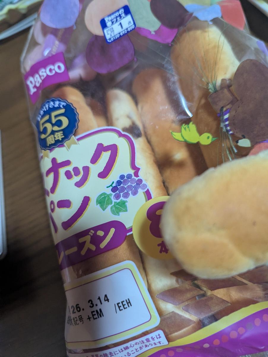 Pascoのスナックパンが大好きですが、レーズン味を初めて見ました。レーズンも好きなので、美味しいに違いないと喜んで購入しました。